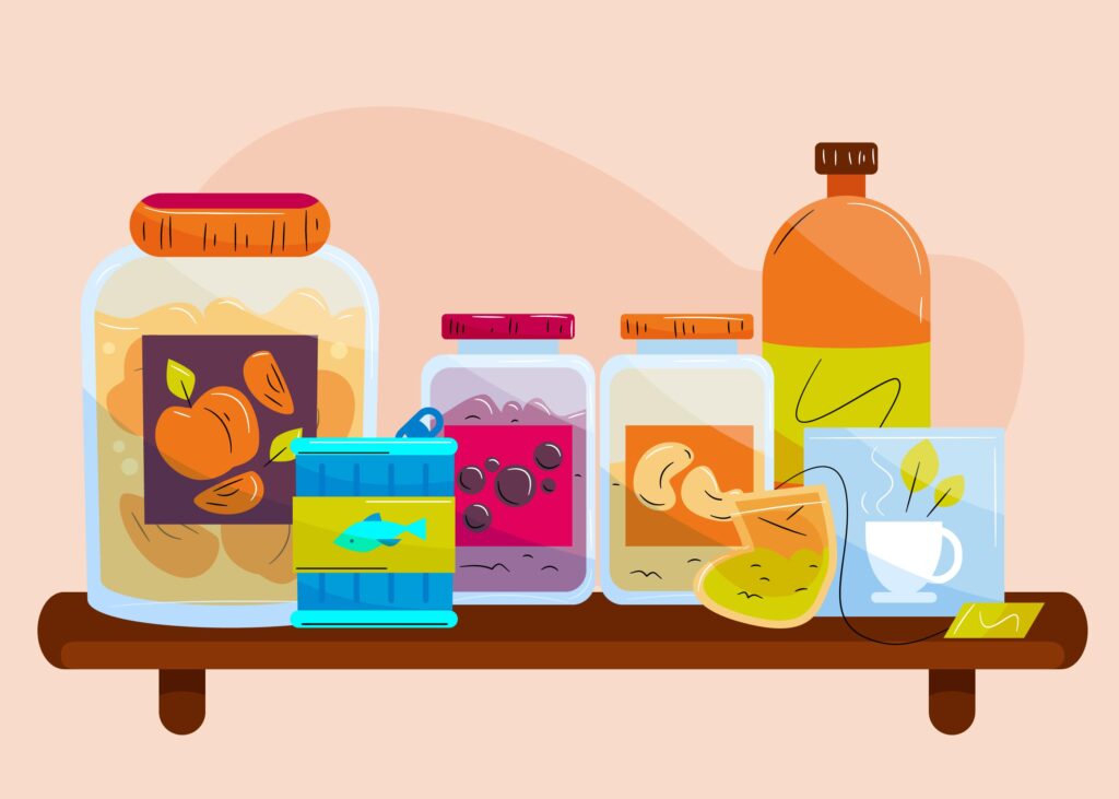 - Conservation à température ambiante : farine, céréales, bouillons, craquelins, beurre d’arachides, pâtes alimentaires, riz, huiles végétales, conserves, etc.