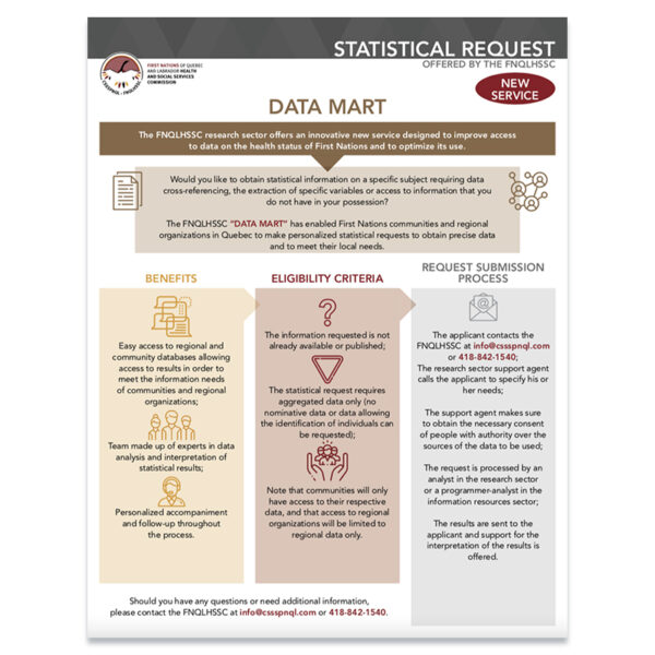 This memory aid presents an innovative service designed to improve access to data on the health status of First Nations and to optimize its use. The FNQLHSSC “data mart” has enabled First Nations communities and regional organizations in Quebec to make personalized statistical requests to obtain precise data and to meet their local needs.
